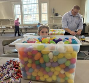 It’s Easter Egg Stuffing Time for the Heisey’s as Elise hides behind a pile ‘o eggs.